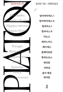 플라톤전집 7권은 「알키비아데스」 I·II, 「힙피아스」 I·II, 「미노스」, 「에피노미스」, 「테아게스」, 「클레이토폰」, 「힙파르코스」, 「연인들」, 「서한집」, 「용어 해설」, 「위작들」을 수록하고 있다.